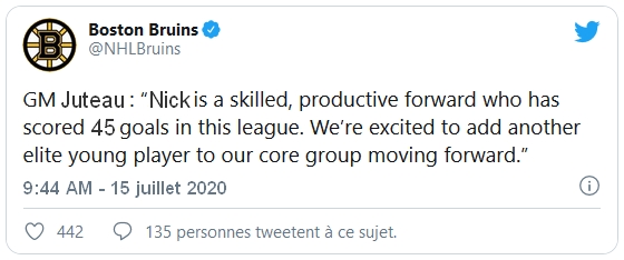 Domi échangé aux Canadiens pour N.Schmaltz 2020-07-15 Le Canadien a annoncé mardi soir avoir envoyé l'attaquant Nick Schmaltz et un troisième choix en 2020 aux Bruins de Boston, en retour du fougueux Max Domi. Domi, un choix de premier tour des Bruins en 2013, a marqué 41 buts lors des trois dernières saisons. Il a totalisé 42 points en 82 matchs en 2019-2020, sa troisième campagne dans le circuit Larivee. L'organisation des Bruins ont rapporté les propos du directeur général Emilien Juteau sur les réseaux sociaux. « Nick est un attaquant talentueux et productif qui a déjà marqué 31 buts dans cette ligue, a déclaré le DG. Nous sommes excités d'ajouter un autre jeune joueur de haut calibre parmi notre noyau. Il a eu du succès à la position de centre. Je ne crois pas que nous aurions fait cet échange si nous ne pensions pas qu'il en était capable. » « Max est un joueur talentueux et une bonne personne, a ajouté Juteau au sujet de Domi. Montréal lui offrira un nouveau départ et nous lui souhaitons la meilleure des chances dans le futur. » Marc Bergevin, assisant directeur général en conférence de presse « C'est une transaction déchirante pour nous, mais également excitante. À l'époque l'idée d'aller chercher Schmaltz contre Dvorak était mon idée. Nick a connu une très bonne première saison il y a 2 ans, et cette année il a définitivement aidé notre équipe à remporter une coupe. Nous avons présentement quelques problèmes avec notre masse, et cette transaction nous permet pour le moment de sauver de l'argent. D'un autre côté nous sommes heureux d'aller chercher un gars comme Max. On aime vraiment sa fougue, son arrogance et en plus il est talentueux. L'organisation pense avoir conclu une bonne transacton pour l'équipe. On souhaite la meilleure des chances à Nick. »